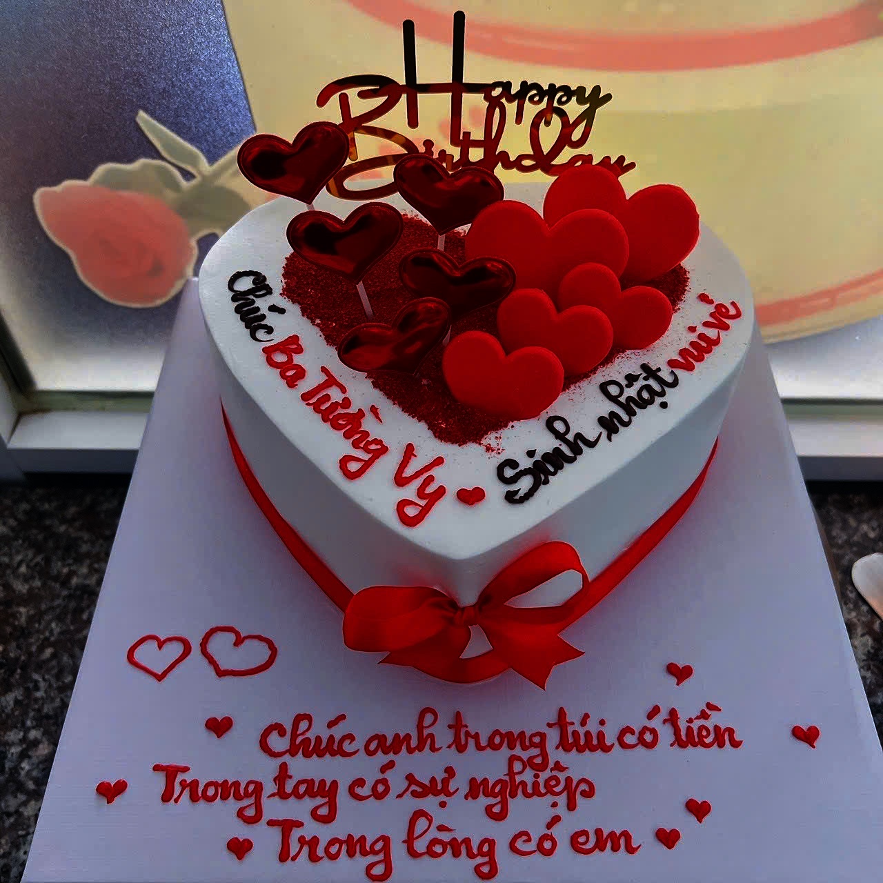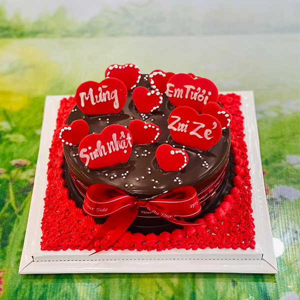 Một chiếc bánh tuy đơn giản nhưng cực kỳ ngọt ngào với vô số trái tim đỏ thắm lớn nhỏ đặt trên mặt bánh cũng mang hình trái tim. Không cần quá nhiều lời chúc dài dòng, dòng chữ “Chúc mừng sinh nhật” cùng với từ “Em” rất dịu dàng như 1 cách khẳng định chủ quyền và ý nghĩa của chiếc bánh.